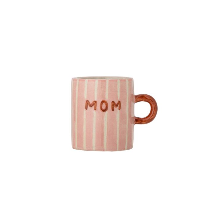 Cherish kruset fra Bloomingville er fremstillet i stentøj med blank glasur og lodrette cremefarvede striber. Kruset er dekoreret med teksten “Mom” på den ene side og “Love” på den anden, med håndmalede detaljer, der giver designet ekstra dybde. Små variationer i mønster og farveintensitet gør hvert krus helt unikt.