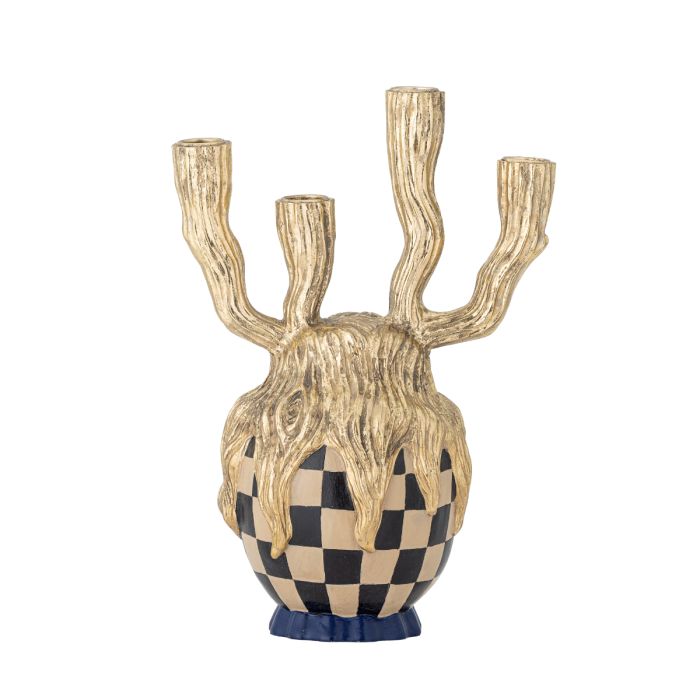 Medusa Lysestage fra Bloomingville er en kunstnerisk og unik detalje, der tilføjer et kreativt touch til din indretning. Hver lysestage er omhyggeligt håndmalet, hvilket gør hver enkelt helt speciel. De gyldne nuancer og det skakternede mønster gør den til et iøjnefaldende pryd, der med fordel kan placeres på spisebordet eller sofabordet.