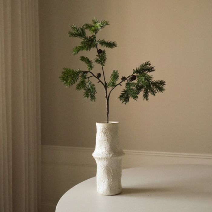 Tilføj et strejf af naturens ro med denne smukke grønne fyrregren, udsmykket med korte, tætte nåle i dybe grønne nuancer. De små grankogler, der diskret pryder grenen giver et naturligt og levende udtryk.