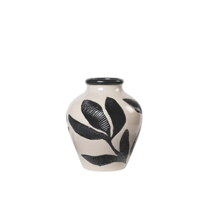 Herbert-vasen fra Broste Copenhagen forener tidløs elegance med naturlige detaljer. Den smukt designede amfora-silhuet er lavet af højkvalitets keramik og prydes af et subtilt bladmønster, der giver vasen et både organisk og moderne udtryk.