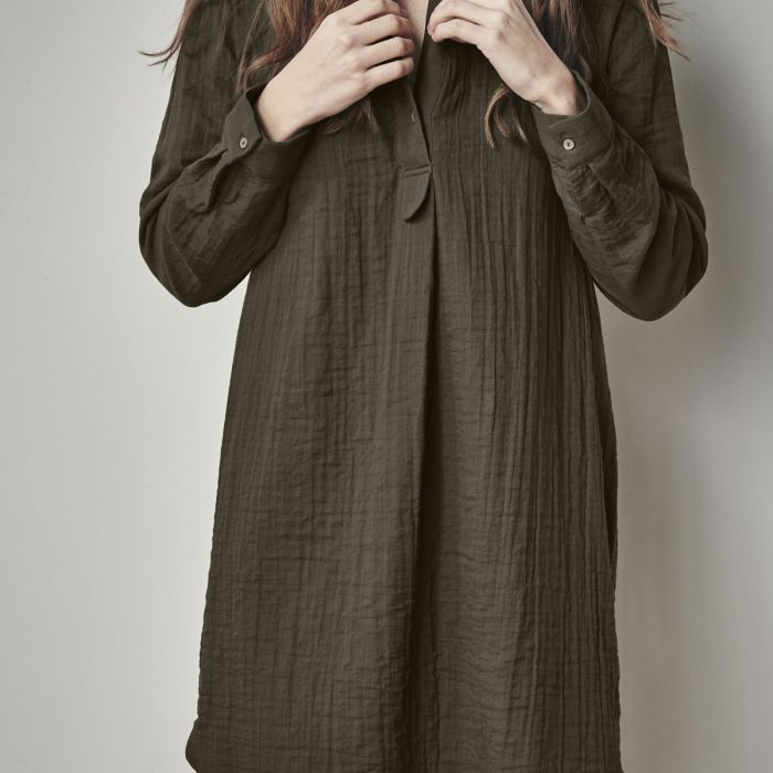 Fald i søvn i denne grønbrune skjortekjole, som er definitionen på luksuriøs komfort. Alt ved den udstråler diskret stil. Det dobbeltsidede bomuld i et afslappet og bevidst krøllet look. Knapperne foran og den buede søm forneden. Og ikke mindst den behagelige pasform, der giver dig fri bevægelighed. byNORD har designet Alfrid med mange formål i tankerne. Brug den som nattøj og som loungewear, når det er tid til at slappe af i weekenden. Du kan endda bruge den som en del af dit outfit. Med et så alsidigt design kan du gå fra sengen til at læse en bog i sofaen med sti