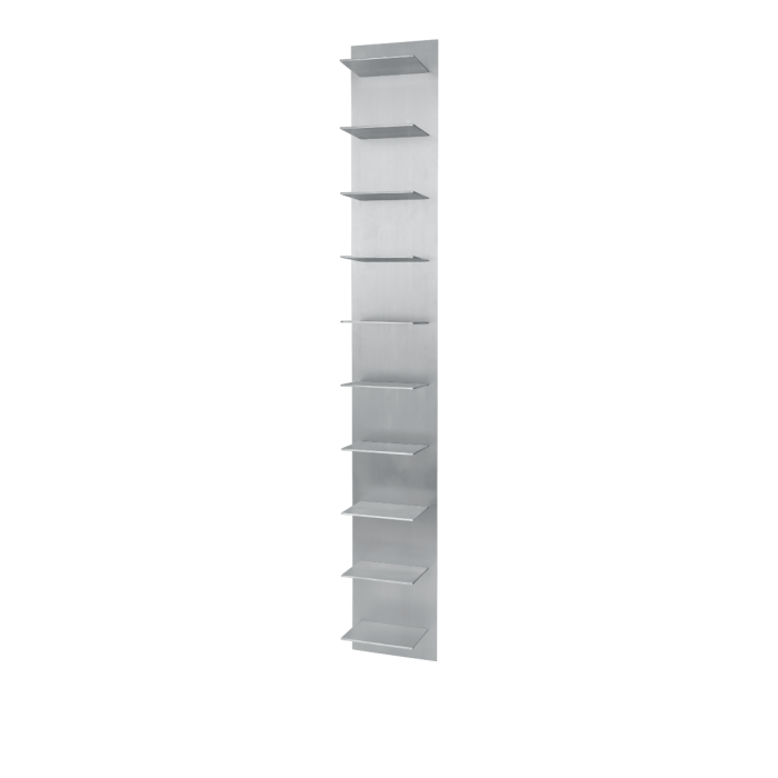 Lager væghylden i højt, aflangt format byder på en enkel og stilren løsning til væghængt opbevaring. Fremstillet i børstet aluminium med et diskret industrielt udtryk, er den ideel til bøger og andre genstande.