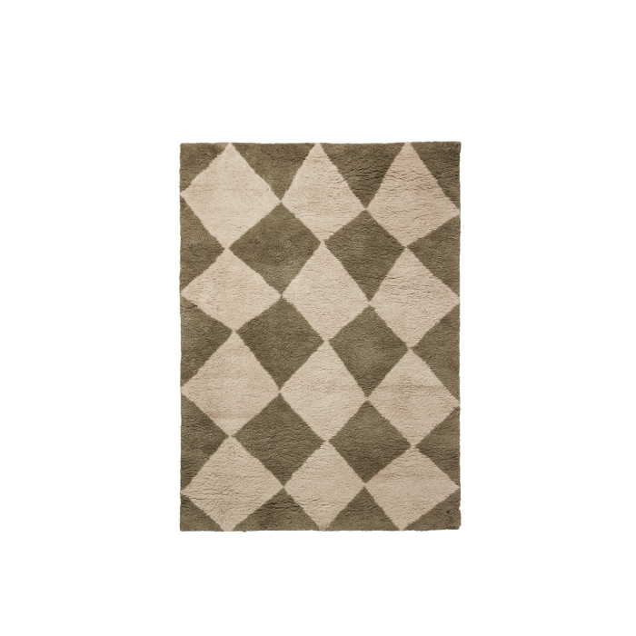 Tilt tæppet bringer energi og karakter til rummet med sit forskudte diamantmønster og subtile kontraster. Det asymmetriske design skaber en følelse af bevægelse og giver indretningen et grafisk præg med dybde og rytme.