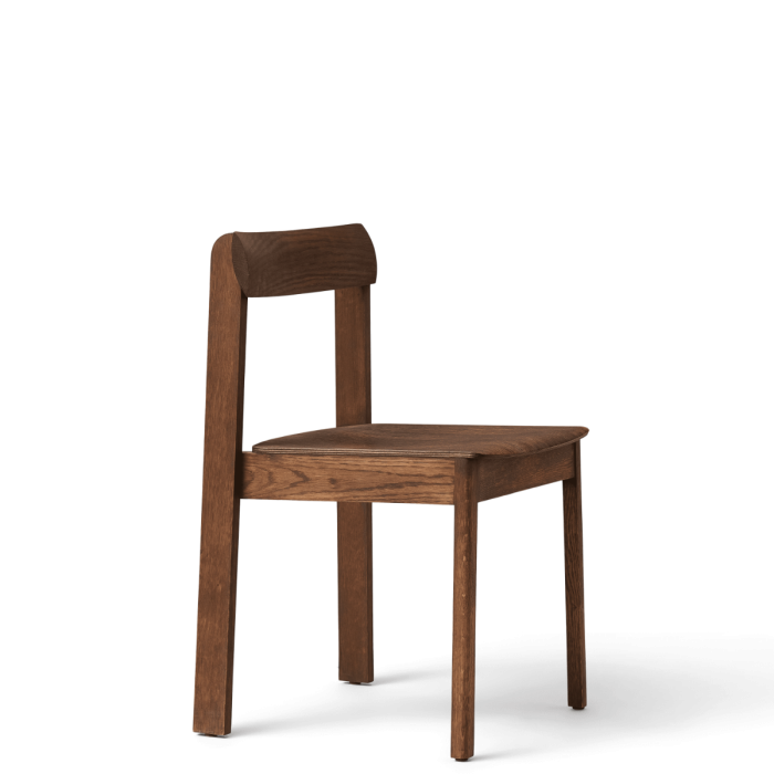 Sædet er nøje formet for at sikre en afslappet og komfortabel siddeposition., mens den smukt udformede rygstøtte i ét solidt stykke træ tilfører et unikt og organisk udtryk. Stolens stærke ben og lette finérsæde skaber en flot balance mellem robusthed og lethed uden synlige skruer, hvilket giver et rent og elegant look.