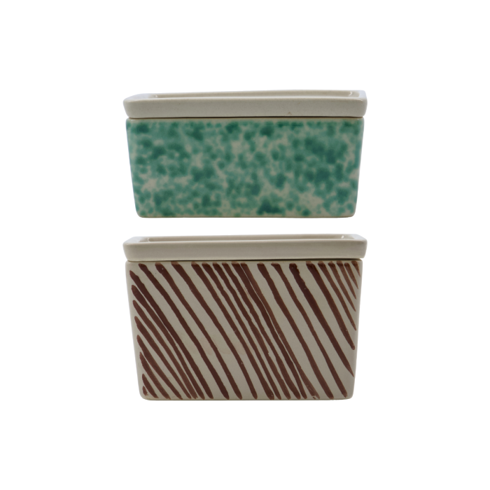 Tilføj et strejf af kunstnerisk elegance til dit køkken med dette sæt stentøjsopbevaringskasser. Hvert stykke er unikt håndmalet, med den ene kasse prydet af brune striber og den anden med et smukt grønt stænkmønster.
