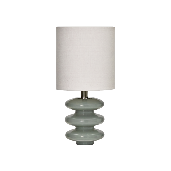 Med sin skulpturelle lyseblå glasfod og klassiske råhvide bomuldsskærm bringer denne bordlampe både farve og lethed ind i rummet. Det håndlavede design gør hver lampe unik, mens det bløde, varme lys skaber en hyggelig stemning. Perfekt til både stue, soveværelse eller hjemmekontor.