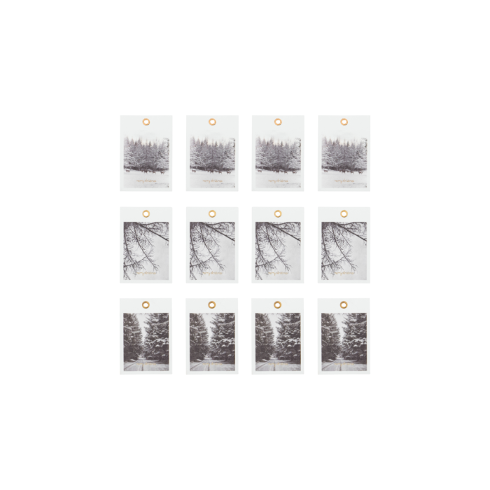 Sættet indeholder 12 kort i hvidt papir fordelt på tre forskellige design, hver prydet med fine vintermotiver og gyldne glimmerdetaljer. Et hul i toppen gør det nemt at fastgøre kortene med bånd, mens den medfølgende metalring holder dem samlet og pænt organiseret.