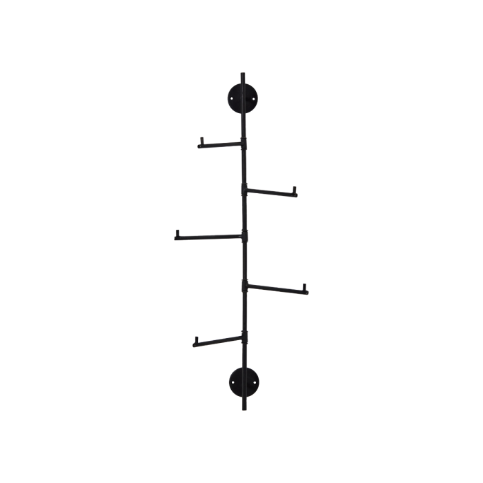 Udført i håndlavet sort jern og designet med fem drejelige kroge, tilbyder den fleksibel opbevaring samtidig med, at den fungerer som et skulpturelt blikfang på væggen.