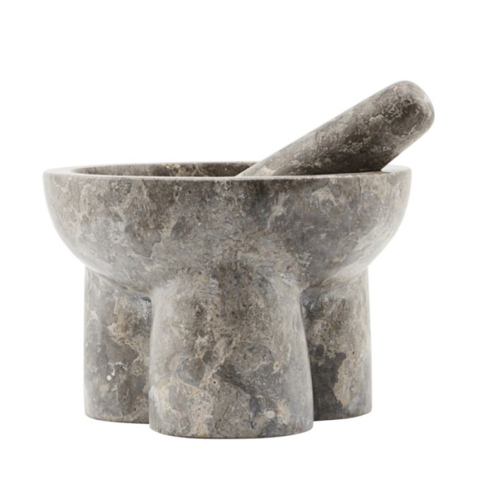 Kulti morteren kommer sammen med en støder i samme farve og stil. Morterens skulpturelle form giver et råt udtryk, som spiller flot sammen med de grå og brune nuancer. Det robuste, dekorative materiale, marmor giver et smukt og brugbart design, der vil være en flot tilføjelse til køkkenet.