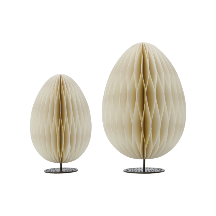 Sæt med to æggeformede papirornamenter i blød off-white med en detaljeret honningkage-struktur. Hvert ornament leveres med en dekorativ jernfod med udskårne detaljer til fritstående dekoration, samt en tråd til ophæng.