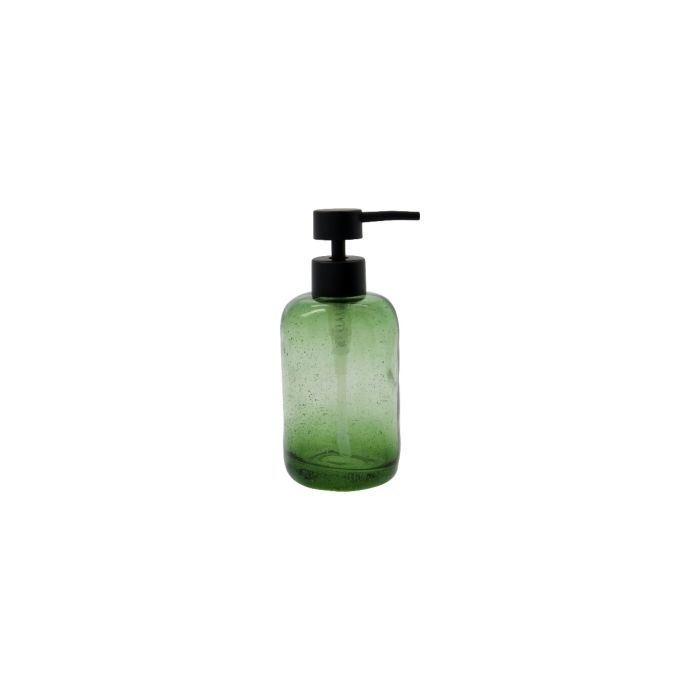 HDWah-sæbedispenseren er udført i mørkegrønt glas med dekorative luftbobler og en stilren, matsort pumpe. Det minimalistiske design forener holdbarhed med et elegant og raffineret udtryk.