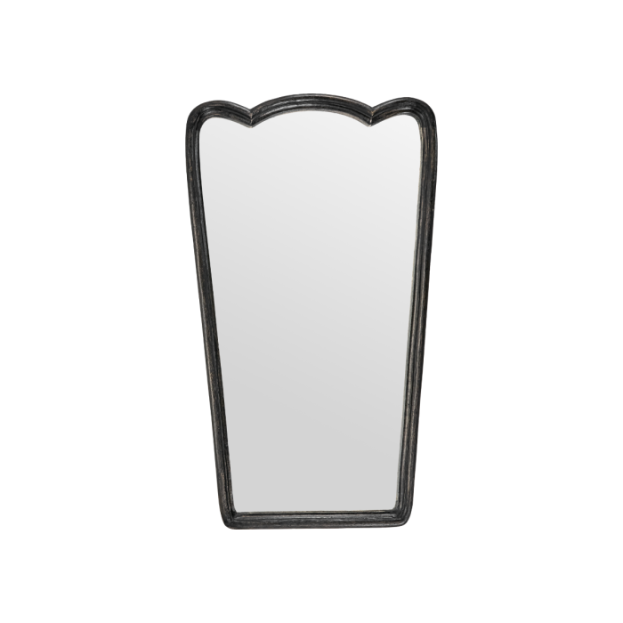 Giv din indretning et sofistikeret løft med dette spejl, der kombinerer elegant formsprog med et råt og naturligt udtryk. Den håndlavede ramme i sortlakeret mangotræ tilfører varme, dybde og personlighed til rummet, mens de bløde buer foroven skaber et let og kunstnerisk udtryk.