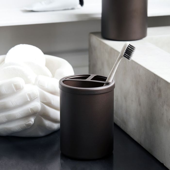 Brug denne holder i aluminium til at give dit badeværelse en hurtig opdatering uden at lave den store investering. Bush er designet af House Doctor og kommer i en mat brun farve, der tilføjer et tidløst, men moderne twist til dit badeværelse. Brug den som en tandbørsteholder og placér dine tandbørster i de to små rum, mens det større rum passer til din tandpasta. For at vaske holderen skal du blot fjerne låget. Sæt den sammen med sæbedispenseren i samme design for et sammenhængende look ved din vask.