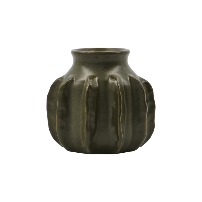 Den dybe mørkegrønne glasur giver vasen et sofistikeret og tidløst udtryk, der fremhæver dens unikke former og tekstur.