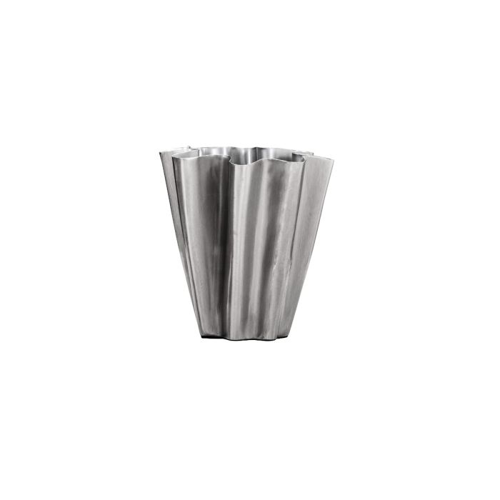 Vasen Flood, small er i jern med en bølget form og finish i børstet sølv, der giver rummet et råt og elegant blikfang.