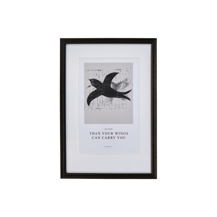 Tilføj et kunstnerisk touch til dit hjem med denne smukke vægkunst, hvor en markant sort fugl i flugt kombineres med tankevækkende tekst, og skaber et drømmende og inspirerende motiv. Kunstværket er indrammet i elegant sort aluminium og omgivet af en hvid passepartout, som giver både dybde og fokus til designet. Dette værk er ideelt til at skabe en harmonisk og stilfuld gallerivæg og passer perfekt sammen med andre kunstneriske motiver, der tilsammen løfter din boligindretning.