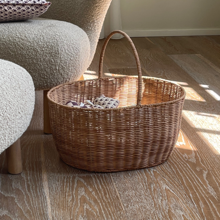 Med sit tidløse og enkle udtryk passer kurven perfekt ind i både moderne og nordiske hjem.Kurven er ideel til opbevaring af tæpper, magasiner eller legetøj, men kan også bruges som en stilfuld indkøbskurv til hverdagens små ærinder. Det flettede rattan giver et varmt og naturligt udtryk, mens det solide håndtag gør kurven nem at bære rundt på.Hver kurv er unik, da den er håndlavet, og små variationer i farve og form giver den et personligt præg.