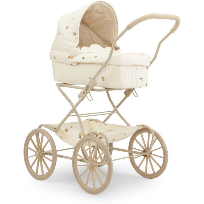 Dukkevogn i vintage stil designet med fire store hjul lavet i EVA-materiale for ekstra stabilitet. Med quiltet trykt stof. Designet med en blødt polstret opbevaringskurv under liften. Rammen er lavet af metal med svampede bløde håndtag. Dukkevognen kommer færdigmonteret og er nem at folde sammen og opbevare.