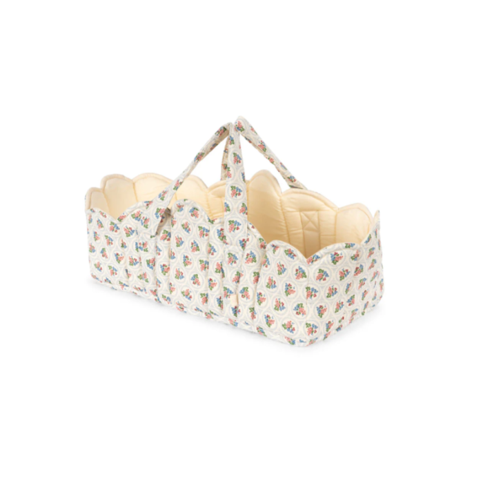 Polstret dukkelift med bløde stropper, fine muslingekanter og dekorativt kantbånd, der kombinerer komfort og stil til legens hyggelige stunder.