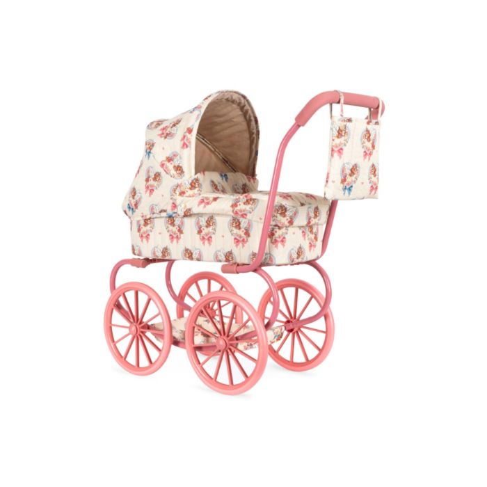 Den praktiske baldakin kan foldes ned, og der er en polstret opbevaringskurv under vognen til alle dukkens småting. Stellet i metal har bløde skumhåndtag, der gør det behageligt at skubbe vognen rundt.