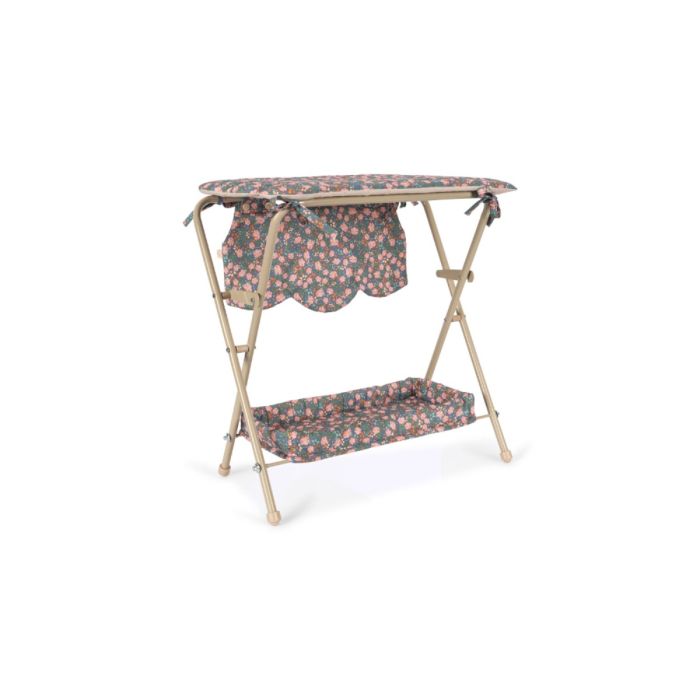 Dette funktionelle dukke puslebord er designet med en robust metalramme og en blød, bomuldsbetrukket overflade. Bordet har god plads til opbevaring af dukketilbehør både under bordet og i de praktiske sidelommer. De dekorative bølgede kanter tilføjer et elegant touch.