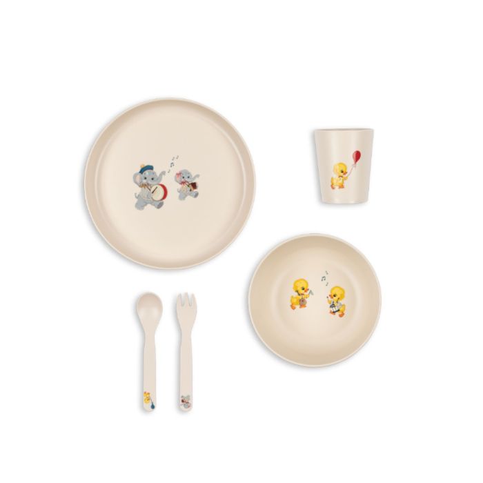 Det fine spisesæt fra Konges Sløjd er fremstillet i 100 procent genanvendt PET og designet til de mindste der vil spise selv. Sættet indeholder en skål, en tallerken, en kop og et bestiksæt i en størrelse der passer perfekt til små hænder og nysgerrige spisevaner.