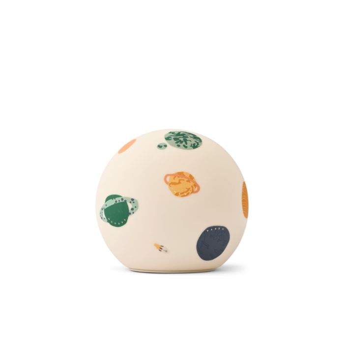 YUKI natlampe spreder et blødt og varmt lys der skaber en beroligende stemning perfekt til rolige aftenrutiner eller hyggelige stunder i løbet af dagen. Brug den på børneværelset eller tag den med til familieaftener og natlige bleskift.Den kugleformede natlampe har legende print og er lavet af blødt og let silikone.