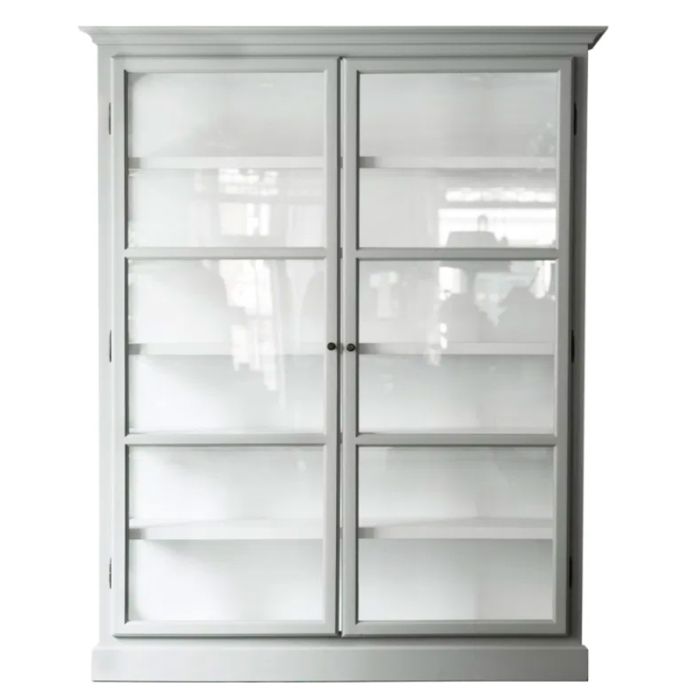 Skabet har glaslåger og den indvendige hvide farve, vil fremhæve de smukke ting, du har stillet på hylderne. Et elegant og tidsløst vitrineskab af høj kvalitet.