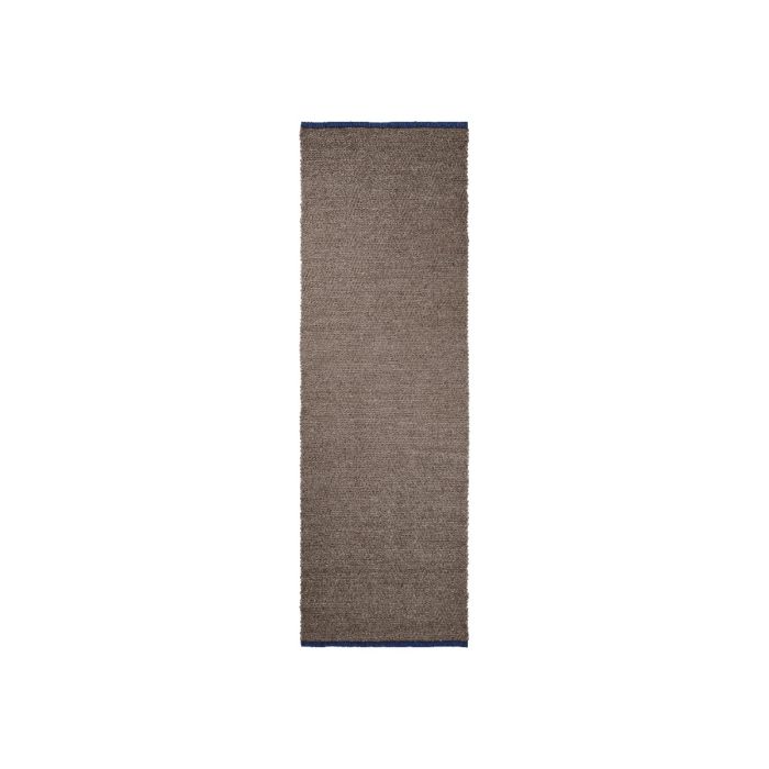 Selvom tæppet er ensfarvet, giver det særlige vævemønster et levende og raffineret spil i overfladen. En koboltblå bort tilfører et sofistikeret farveelement, der skaber en smuk kontrast til den bløde lattefarve. Brug løberen i entreen, ved havedøren eller i køkkenet, hvor du ønsker både æstetik og funktionalitet i hverdagen.