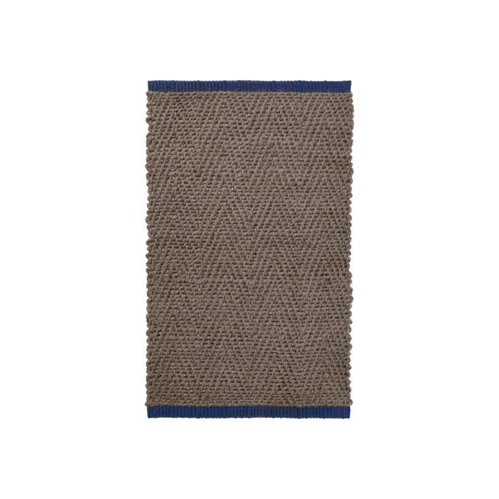 Det karakteristiske vævemønster giver overfladen struktur og liv, mens den varme lattefarve får et friskt modspil af en koboltblå bort. Måtten er kraftig og robust.Ideel ved havedøren, hoveddøren eller i entreen.