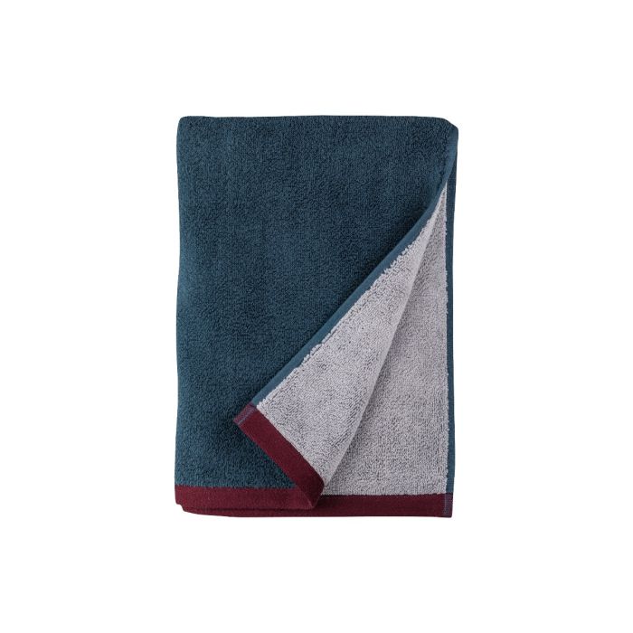 Håndklædet har et dobbeltsidet design med petroleumsblå på den ene side og lysegrå på den anden, indrammet af en vinrød bort, der skaber en smuk og balanceret kontrast. Det rolige design leger subtilt med farver og tilfører et elegant og harmonisk udtryk.