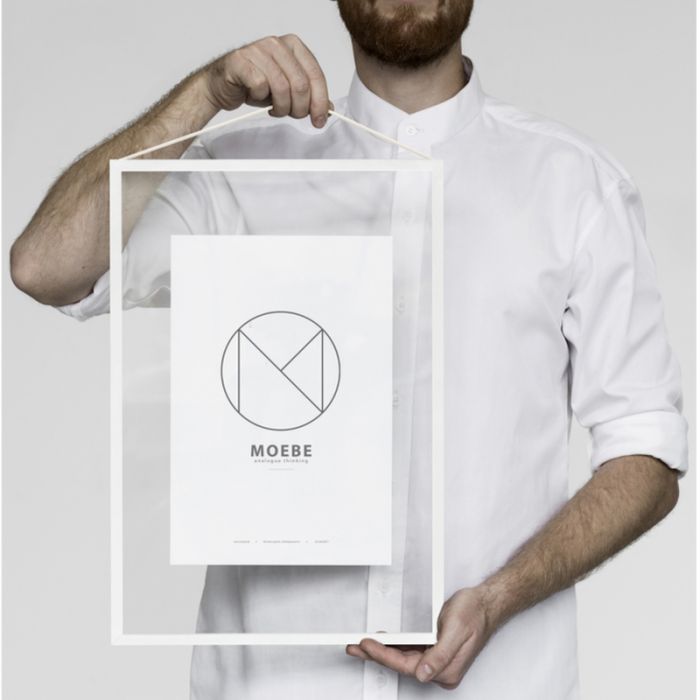 Moebe har gennemtænkt hele designet på rammen, som består af fire løse sider i en flot hvid aluminium, akryl glas, og en hvid elastik som holder det hele sammen.