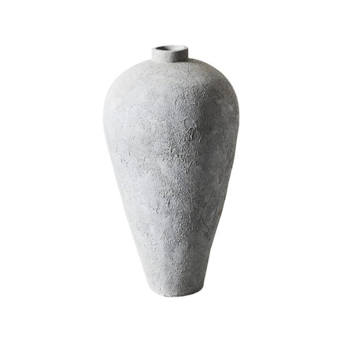 Stor gulvvase i grå terrakotta fra MUUBS, med en rustik overflade og organisk form, der gør den til en skulpturel dekoration i både stue og orangeri.
