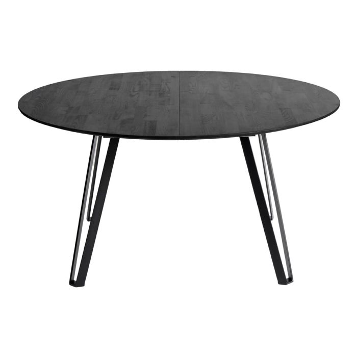 Den sortbejdsede overflade fremhæver træets naturlige årer, og det runde design skaber en hyggelig atmosfære, hvor alle nemt kan tale sammen.