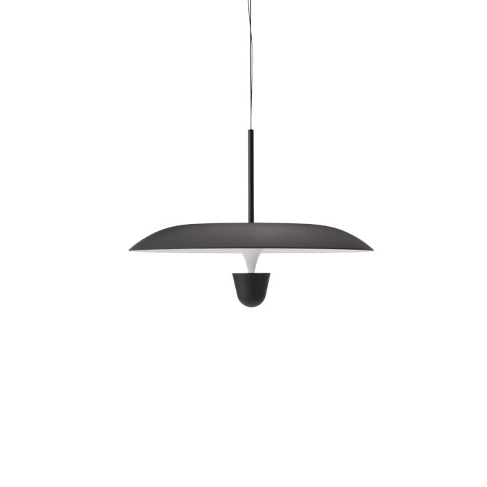 Det unikke design med to koncentriske cirkler, skærmen og reflektoren giver lampen et skulpturelt udtryk, der både tiltrækker opmærksomhed og skaber en visuel ro i indretningen.