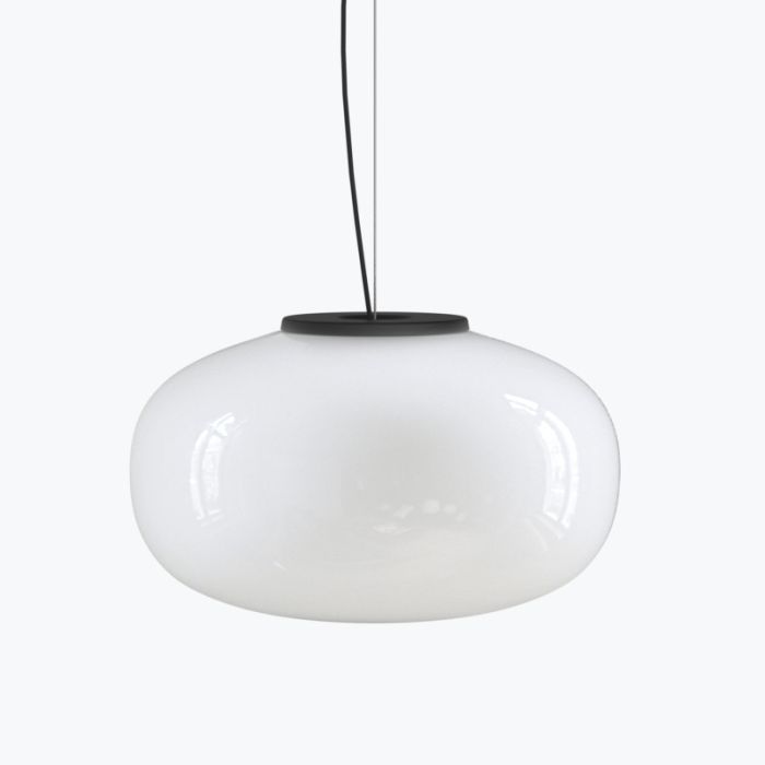 Skygge i mundblæst opalglas med sort pulverlakeret stålbeslag