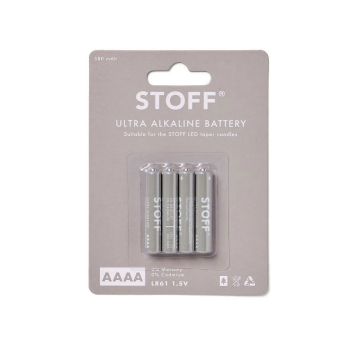 4 pakke AAAA batteri, 1,5V, 580mAh. Velegnet til STOFF LED koniske stearinlys. Brændetiden er ca. 150+ timer med 2 stk. AAAA-batterier pr. LED konisk lys.