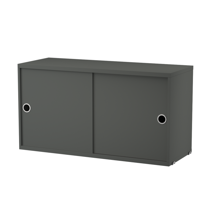 Skabet med klaplåge er tilgængeligt i to forskellige bredder: 78 cm og 58 cm, og har en dybde på 30 cm. Højden af skabet er 42 cm. Det passer sammen med alle tråd- og plexpaneler fra String® System, der har en dybde på 30 cm. Skabet indeholder en justerbar indvendig hylde.