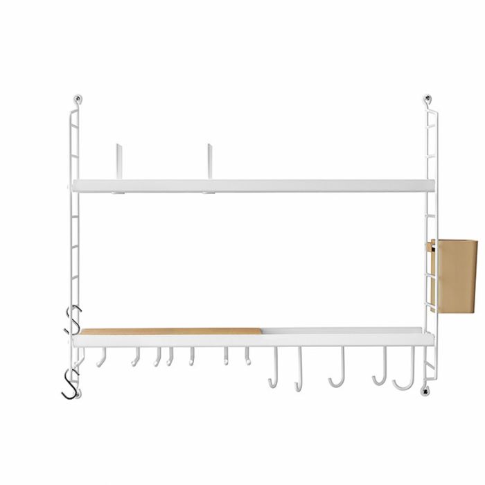 Med et lille køkken i tankerne har String samlet de mest essentielle køkkenprodukter i én kasse. Den omfatter følgende produkter: to paneler h50 x d20 cm i hvid, to metalhylder med lav kant b58 x d20 cm i hvid, en tallerkenstativ d20 cm i hvid, to bøjlestativer d20 cm i hvid, et underlag b19,3 x d29,6 x h1,85 cm i kork, en organizer b9 x d7 x h12 cm i beige, fem j-kroge i hvid og to s-kroge i rustfrit stål.