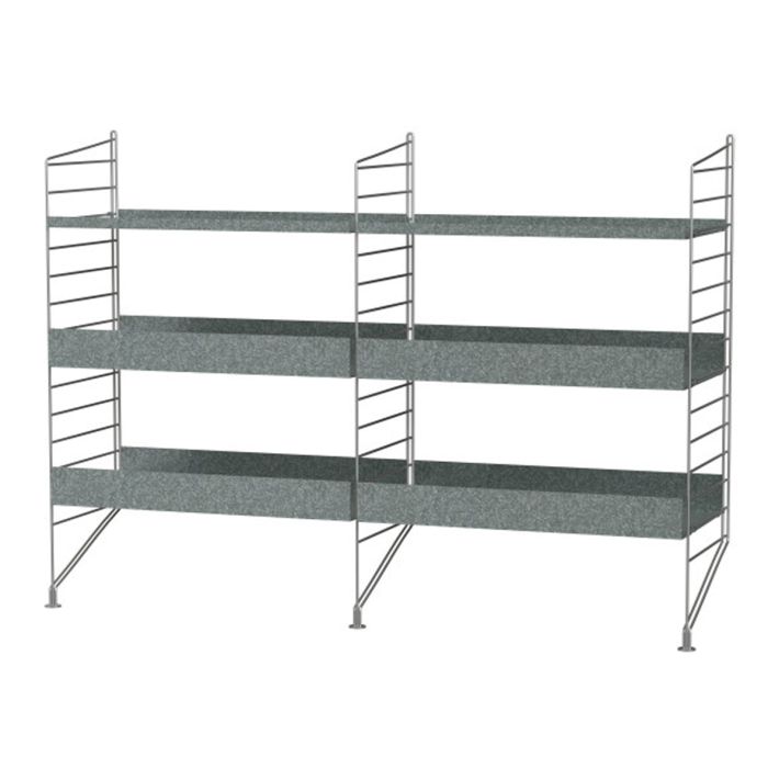 De galvaniserede hylder fra String System er skabt til udendørs brug. Denne gulvmonterede kombination i to sektioner er beregnet til udendørs brug. Med galvaniserede paneler og hylder skifter overfladen med tiden og efterlader dig en smuk patina. En kombination af hylder med høj og lav kant giver enhedens karakter.