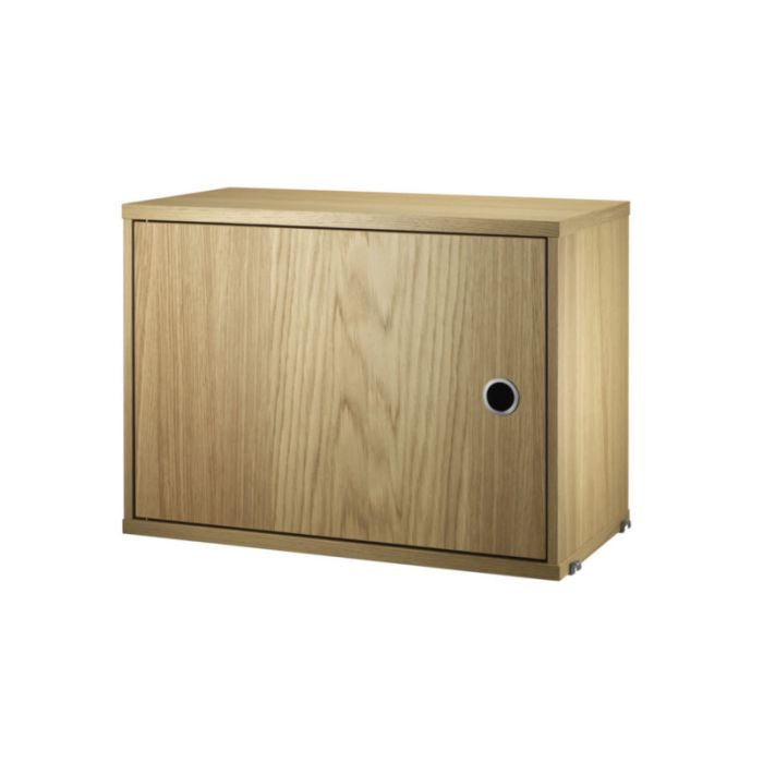 Med dette kabinet tilfører du ekstra opbevaringsplads til dit String system. Skabets låge kan monteres på både højre og venstre side, så du kan tilpasse det til dit String reolsystems placering. Inde i skabet er der en justerbar hylde, hvorpå du kan placer det, som du ikke ønsker skal stå fremme.