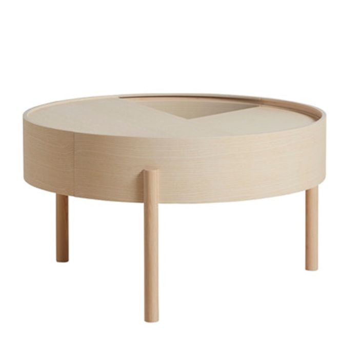 Ved blot at dreje halvdelen af ??det cirkulære låg kan bordets udtryk altid ændres. Overfladen på det indvendige lagerplads er malet i en glat mørkegrå farve som supplement til asketræet, mens den trebenede konstruktion tilføjer et legende og let strejf til det geometrisk formede design.