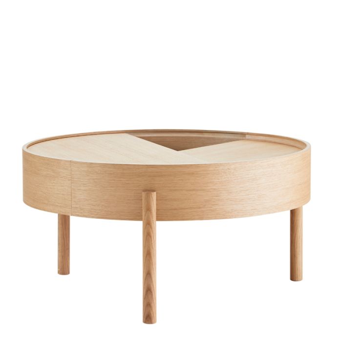 Ved blot at dreje halvdelen af ??det cirkulære låg kan bordets udtryk altid ændres. Overfladen på det indvendige lagerplads er malet i en glat mørkegrå farve som supplement til asketræet, mens den trebenede konstruktion tilføjer et legende og let strejf til det geometrisk formede design.
