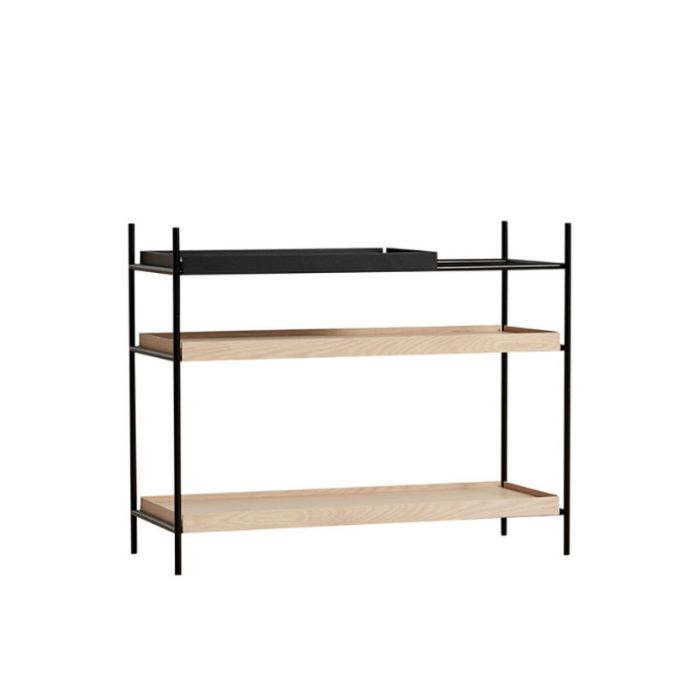 Denne flotte reol er designet af Hanne Willmann. Det er med dette reolsystem muligt at flytte den lille hylde, der tillader at højere genstande kan placeres i det åbne rum. Disse forskellige arrangementer af hylderne gør reolsystemet meget levende og personligt. Flyt bakkerne og læg dem på de forkellige niveauer indtil du har en ordning, der passer til din indretning.